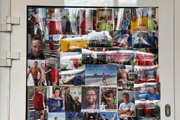 Die Eingangstür vom Restaurant Rindock‘s am ehemaligen Wandsbeker Bahnhof zeigt eine Fotocollage der Elbstaffel.